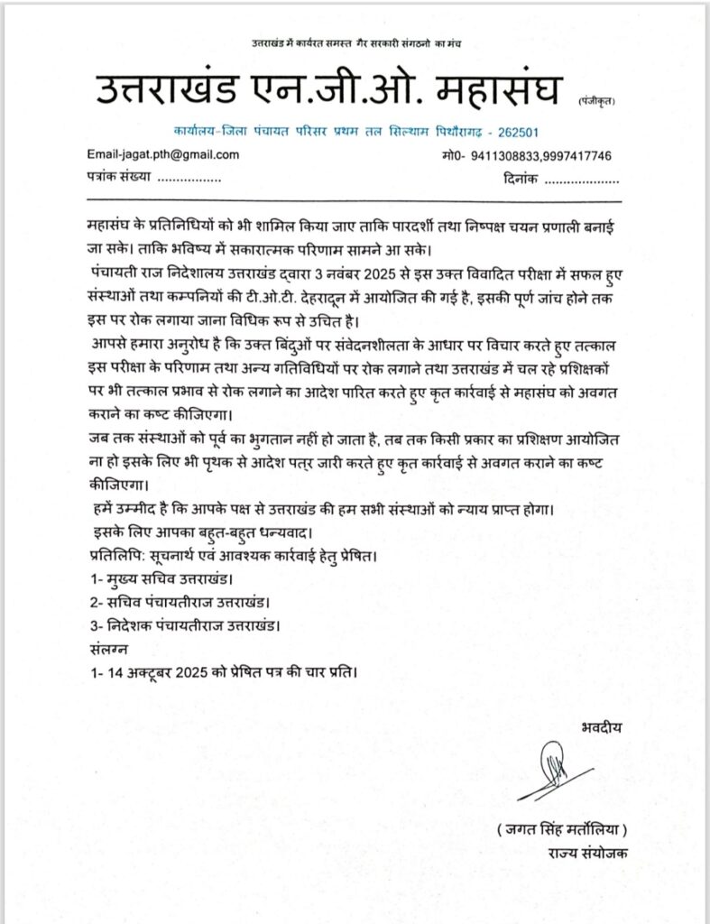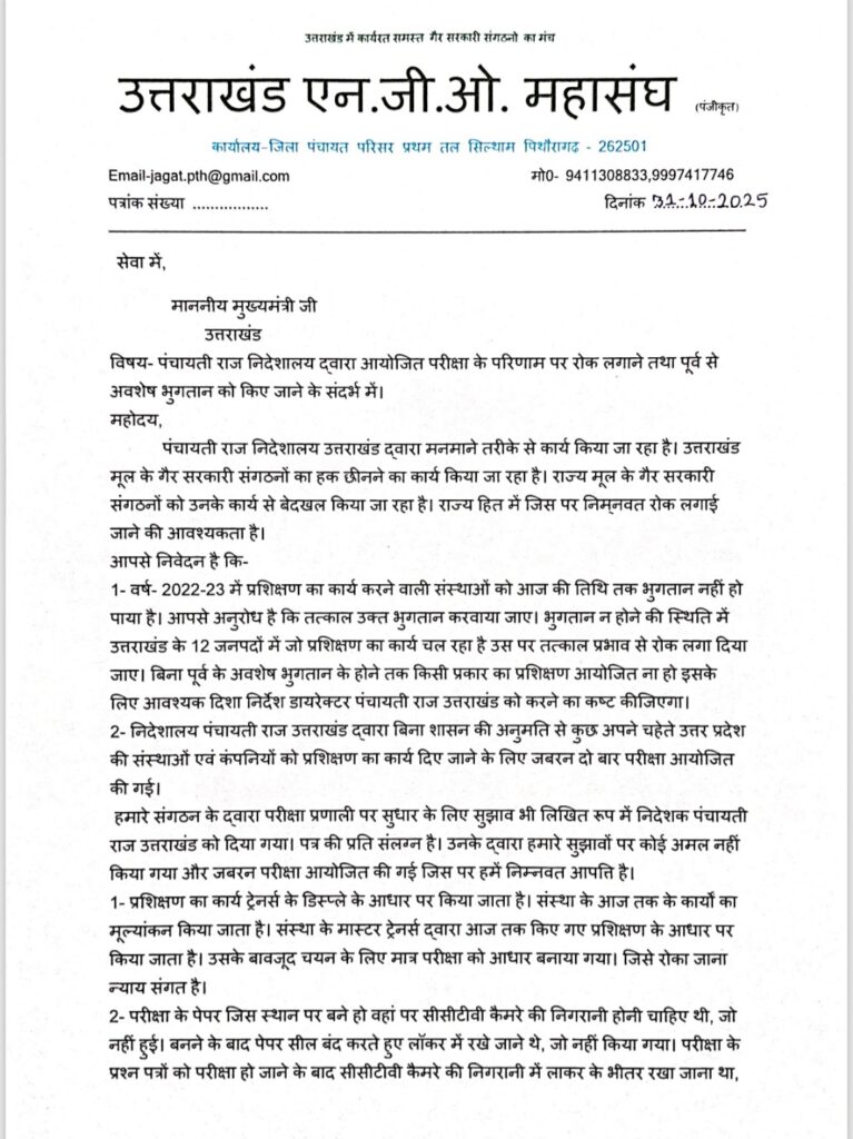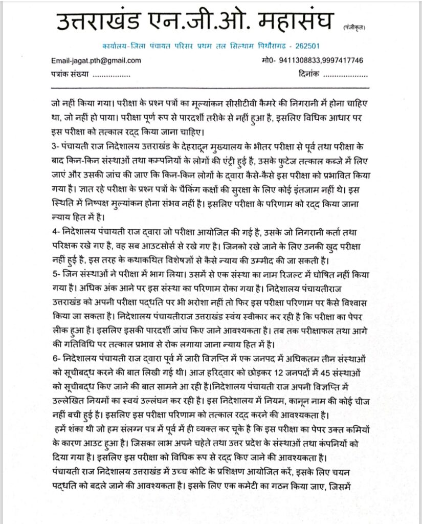 उत्तराखंड गैर सरकारी संगठन (एनजीओ ) महासंघ ने पंचायती राज निदेशालय पर आरोप लगाया कि उनके द्वारा परीक्षा का पेपर अपने चाहतों को पास करने के लिए लीक किया गया था। महासंघ ने कहा कि 18 अक्टूबर के पत्र में इस आशंका को व्यक्त कर दिया गया था, जो सच साबित हुआ है। महासंघ ने प्रदेश के मुख्यमंत्री, मुख्य सचिव तथा पंचायती राज सचिव को आज ईमेल के माध्यम से शिकायती पत्र भेज कर परीक्षा फल सहित समस्त गतिविधियों पर रोक लगाने की मांग की गई है। इसकी उच्च स्तरीय जांच किए जाने एक सप्ताह के भीतर नहीं होने पर मुख्यमंत्री आवास पर सामुहिक आत्मदाह की चेतावनी दी गई है। महासंघ ने आरोप है कि उत्तर प्रदेश की संस्थाओं तथा कंपनियों को प्रशिक्षण का कार्य देने के लिए इस प्रकार का षड्यंत्र रचा गया है।
