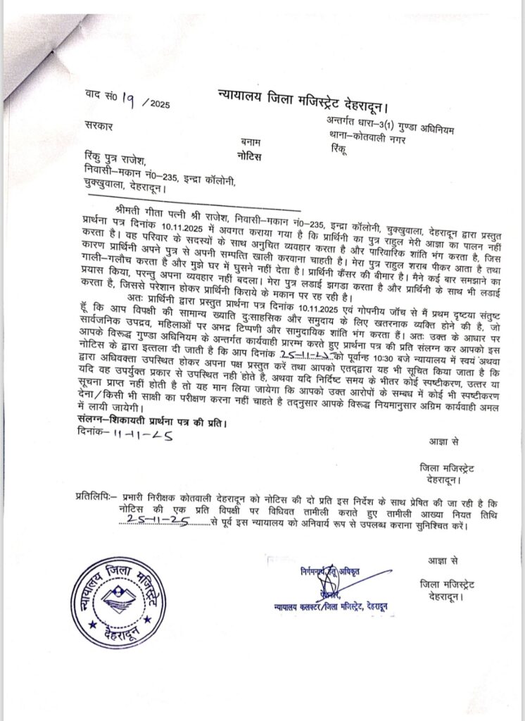 विगत 10 नवम्बर को आयोजित जनता दर्शन कार्यक्रम में बुजुर्ग गीता एवं उनके पति राजेश ने जिलाधिकारी से गुहार लगाई कि उनके 2 बेटे हैं मारपीट करते है तथा तथा उनको घर से बाहर निकाल रहे हैं। बेटे शराब पीकर आते हैं तथा गाली गलौच करते हैं। जबकि माता गीता कैंसर पीड़ित है पुत्रों को समझाने पर भी झगड़ा करते हैं बेटों से परेशान होकर किराए के मकान में रह रहे हैं। जिलाधिकारी ने कैंसर पीड़ित माता व बजुर्ग पिता की व्यथा सुन कोर्ट में वाद दर्ज कराते हुए 02 बेटो को नोटिस प्रेषित कर दिये।