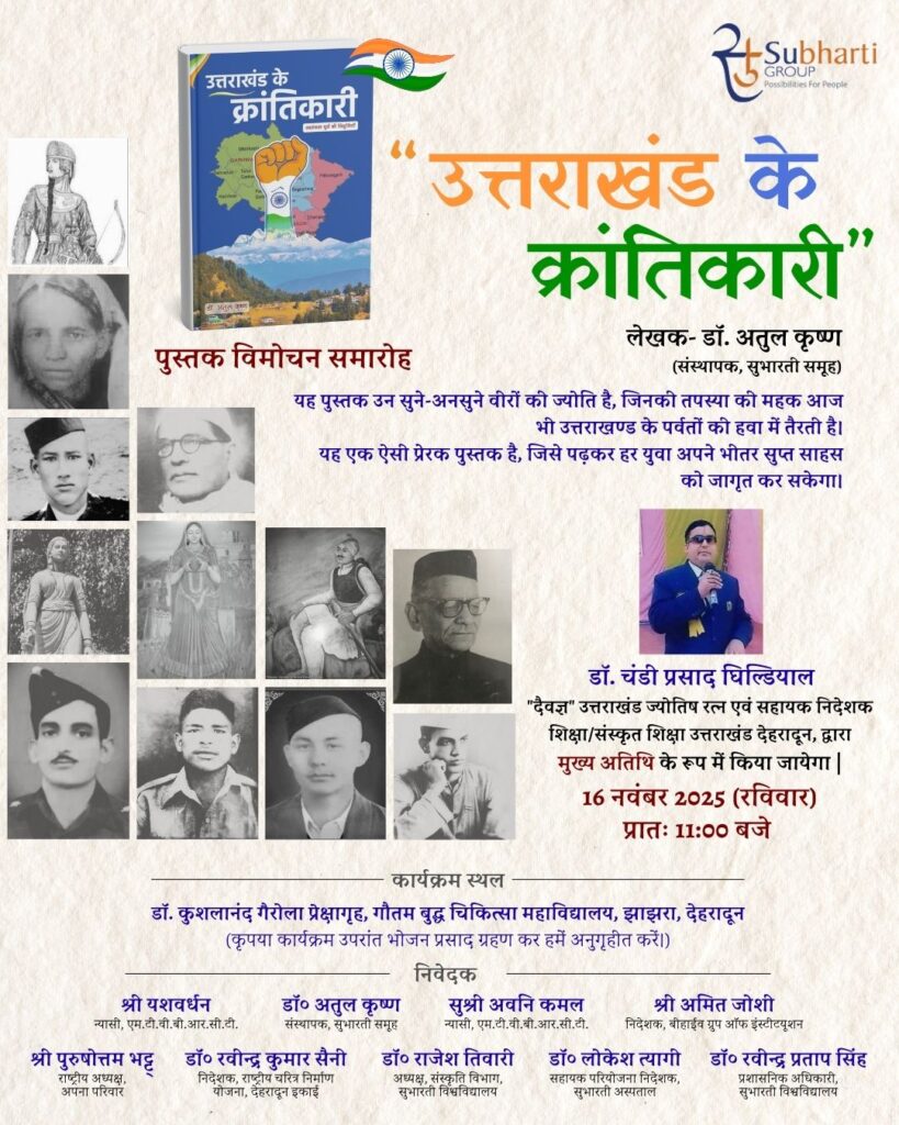 इस महत्वपूर्ण पुस्तक के लेखक सुभारती समूह के संस्थापक डॉ अतुल कृष्ण ने बताया कि 16 नवंबर 2025 रविवार को सुभारती मेडिकल कॉलेज झाझरा के सभागार में उत्तराखंड की वीवीआईपी हस्तियों की गरिमामयी उपस्थिति में “उत्तराखंड ज्योतिष रत्न” एवं सहायक निदेशक संस्कृत शिक्षा डॉक्टर चंडी प्रसाद घिल्डियाल “दैवज्ञ” मुख्य अतिथि के रूप में प्रातः 11:00 बजे पुस्तक का विमोचन करेंगे बताया कि कार्यक्रम की अध्यक्षता वरिष्ठ आईएएस अधिकारी उत्तराखंड शासन में सचिव दीपेंद्र चौधरी करेंगे।