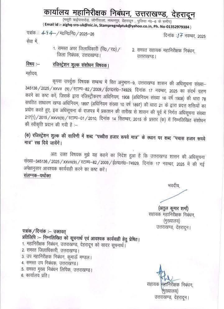 उत्तराखंड सरकार ने भूमि एवं संपत्ति पंजीकरण से संबंधित शुल्क संरचना में महत्वपूर्ण संशोधन करते हुए रजिस्ट्री शुल्क की अधिकतम सीमा को 25,000 रुपये से बढ़ाकर 50,000 रुपये कर दिया है। इस संबंध में संबंधित विभाग द्वारा सभी जिलाधिकारियों एवं उप-पंजीयकों को आधिकारिक पत्र जारी कर दिया गया है।