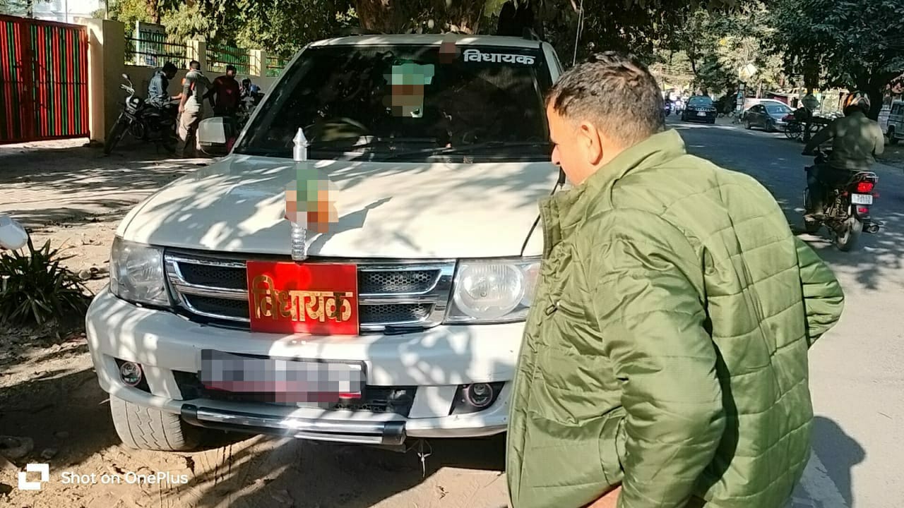 विधायक पुत्र द्वारा नियम विरुद्ध तरीके से वाहन में वीआईपी पट्टिका, हूटर तथा काली फ़िल्म का किया जा रहा था इस्तेमाल