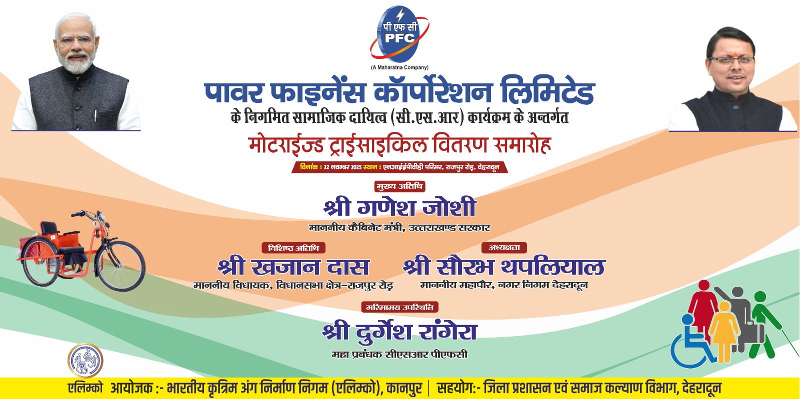 सामाजिक न्याय एवं अधिकारिता मंत्रालय, भारत सरकार द्वारा दिव्यांगजनों हेतु संचालित एडिप योजनान्तर्गत भारतीय कृत्रिम अंग निर्माण निगम लि0 (एलिम्को) कानपुर के सहयोग से पूर्व में चिन्हित 169 दिव्यांगजनों को 22 नवंबर (शनिवार) को प्रातः 11ः00 बजे राष्ट्रीय दृष्टि दिव्यांगजन सशक्तिकरण संस्थान परिसर, राजपुर रोड़, देहरादून में सहायक उपकरण (मोटराईज्ड ट्राई साईकिल) वितरण कार्यक्रम/शिविर आयोजित किया गया है। शिविर में मुख्य अतिथि मा0 कैबिनेट मंत्री श्री गणेश जोशी, श्री सौरभ थपलियाल, मा0 महापौर नगर निगम देहरादून तथा विशिष्ट अतिथि मा0 विधायक राजपुर श्री खजान दास उपस्थित रहेंगे।
