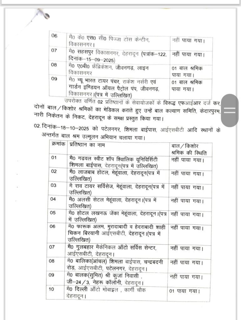 देहरादून में बड़ा अभियान: 07 बालश्रमिक रेस्क्यू, 7 प्रतिष्ठानों पर एफआईआर