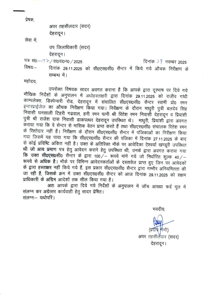 निरीक्षण के दौरान टीम द्वारा केंद्र में संचालित विभिन्न सेवाओं, अभिलेखों, लेन-देन विवरणों तथा सेवा शुल्क आदि की गहन जांच की गई। जांच में कई अनियमितताएं, नियमों का अनुपालन न होना एवं सेवा प्रदायगी में गंभीर त्रुटियां पाई गईं। केंद्र संचालक द्वारा संतोषजनक उत्तर न दिए जाने एवं अनियमितताओं के प्रमाण मिलने पर प्रशासन ने देवभूमि सीएससी सेंटर को तत्काल प्रभाव से सील कर दिया।