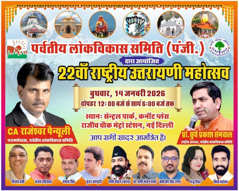 नई दिल्ली : पर्वतीय लोकविकास समिति द्वारा प्रकृति के सम्मान,पर्यावरण चेतना और राष्ट्रीय एकता के प्रतीक पर्व के रूप में वर्ष 2005 से निरंतर संचालित राष्ट्रीय उत्तरायणी महोत्सव इस बार सुखी परिवार फाउंडेशन और दिल्ली सरकार के सहयोग से नई दिल्ली के कनॉट प्लेस स्थित सेंट्रल पार्क में सम्पन्न हुआ।