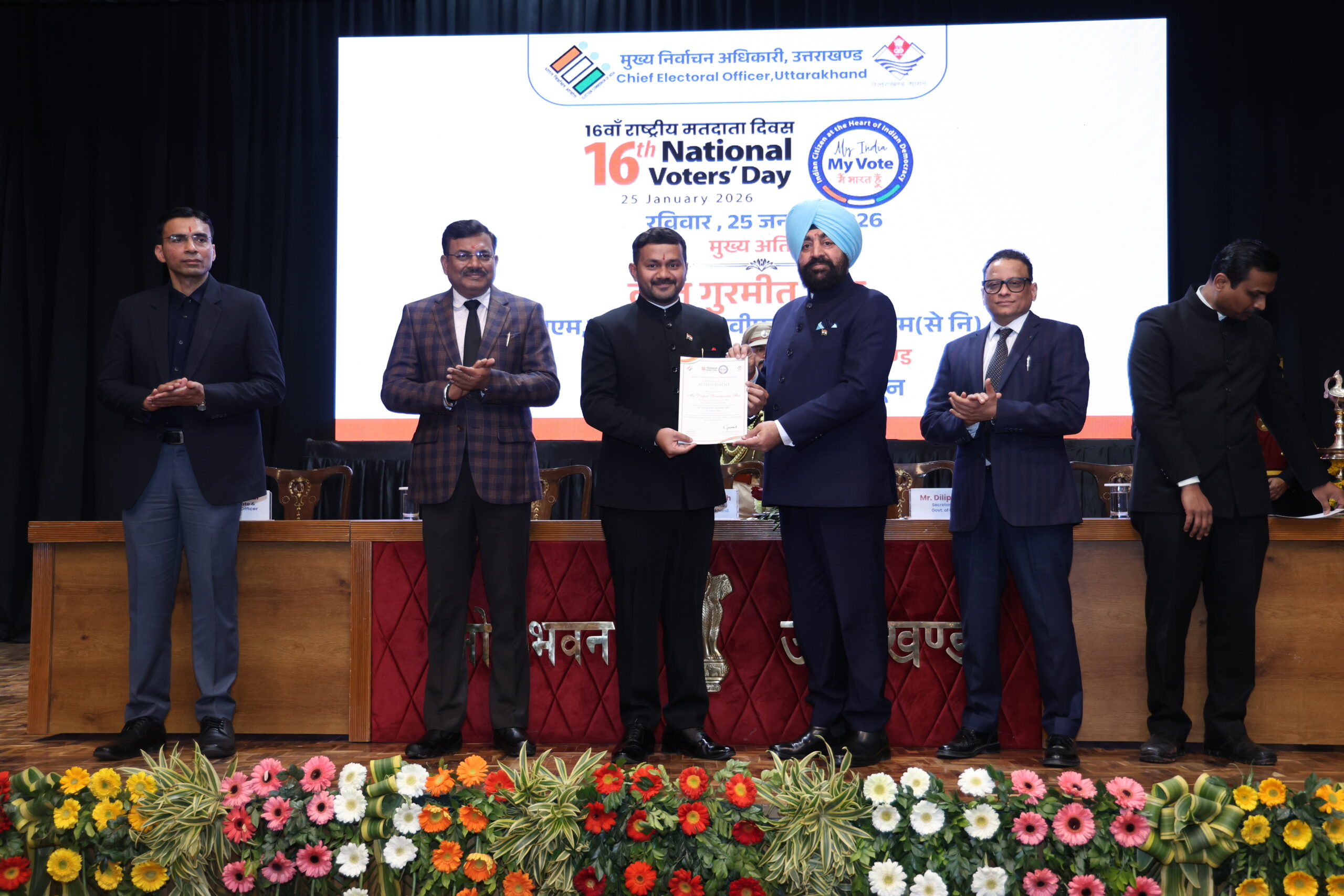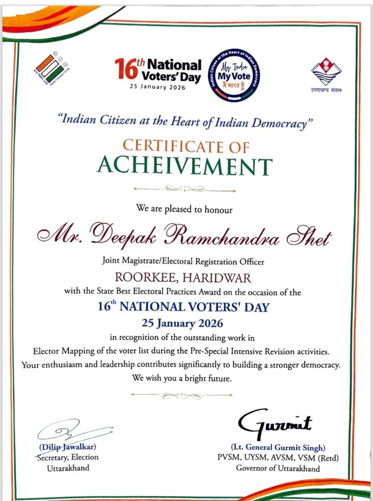 निर्वाचक नामावलियों के शुद्धिकरण एवं अद्यतन हेतु संचालित प्री-स्पेशल इंटेंसिव रिवीजन (Pre-SIR) कार्यक्रम के अंतर्गत इलेक्टर मैपिंग में किए गए उत्कृष्ट एवं सराहनीय कार्य के लिए Deepak Ramchandra Shet, संयुक्त मजिस्ट्रेट रुड़की को 16 नेशनल वोटर पर महामहिम राज्यपाल (लेफ्टिनेंट जनरल गुरमीत सिंह) द्वारा सर्टिफिकेट ऑफ अचीवमेंट प्रदान किया गया।