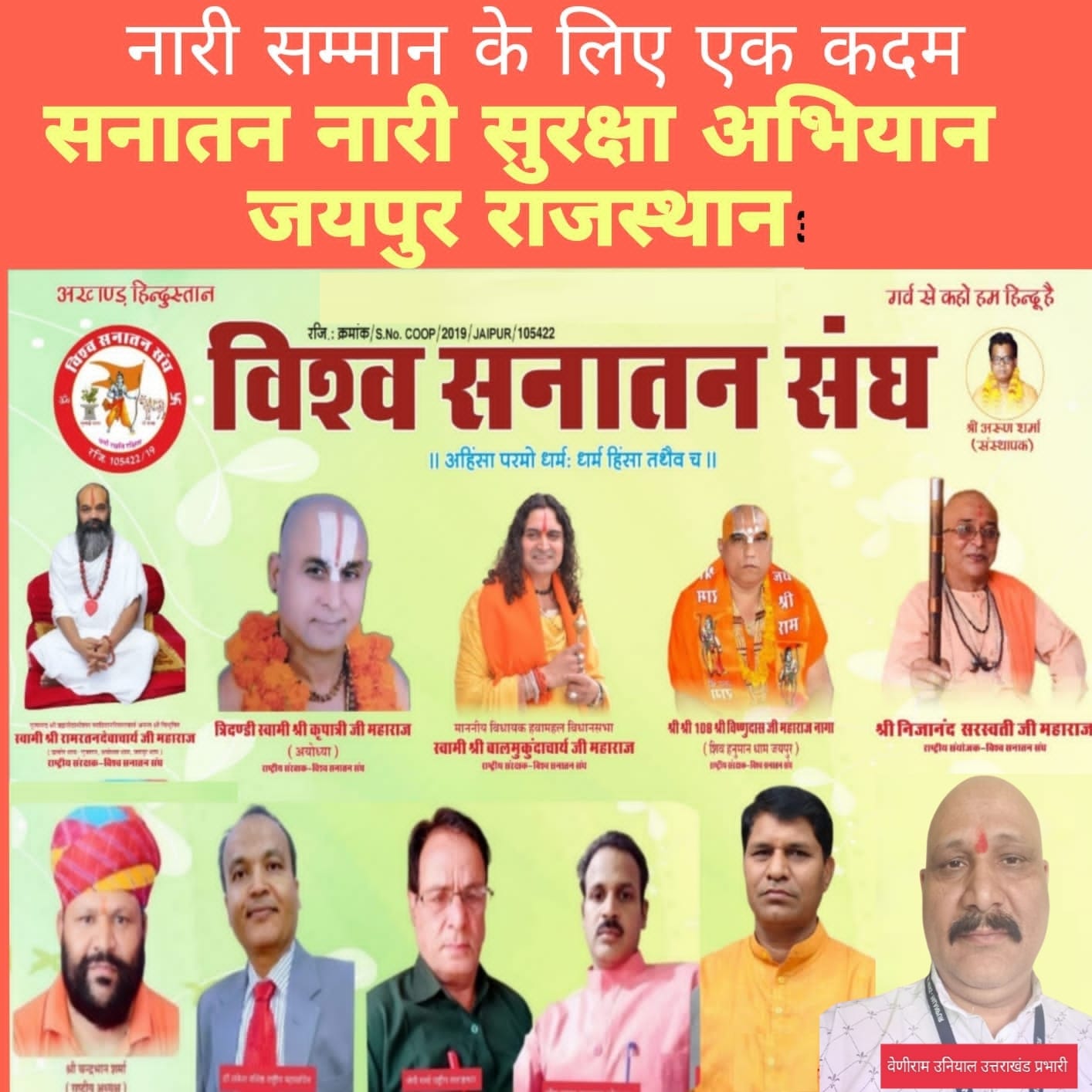 विश्व सनातन संघ द्वारा 30 सितंबर 2025 को कन्या पूजन के पावन अवसर पर सनातन नारी सुरक्षा अभियान का शुभारंभ किया गया। इस अवसर पर कन्या पूजन कर नारी शक्ति के सम्मान व सुरक्षा का संदेश दिया गया। संघ के राष्ट्रीय पदाधिकारियों ने बताया कि अभियान को पूरे देश में फैलाने के लिए विभिन्न राज्यों की टीमें बनाई गई हैं। इसमें राजस्थान से रतन महाराज टीम, उत्तराखंड से बेणीराम उनियाल टीम, महाराष्ट्र से मयूर मिश्रा टीम, मध्य प्रदेश से तरुण जाटव टीम तथा उत्तर प्रदेश से राहुल तिवारी टीम जिम्मेदारी संभालेंगी।संघ ने संकल्प लिया कि बहुत जल्द भारत के हर राज्य और हर जिले में सनातन नारी सुरक्षा अभियान सक्रिय रूप से संचालित किया जाएगा,