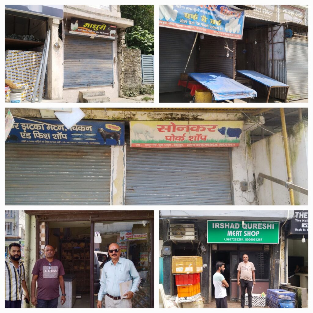 जिलाधिकारी के निर्देशानुसार जनपद देहरादून में नवरात्रि के पावन अवसर पर समस्त मीट-मांस की दुकानों को बंद रखा गया। जिलाधिकारी द्वारा पूर्व में ही संबंधित विभागों को आवश्यक दिशा-निर्देश जारी किए गए थे, जिसके अनुपालन में सभी नगर एवं ग्रामीण क्षेत्रों में मांस विक्रय की दुकानों पर पूर्णतः प्रतिबंध लगाया गया। जिलाधिकारी के निर्देशों के अनुपालन में प्रशासन की टीम द्वारा अलांउसमेंट के माध्यम से नगर तथा आसपास के क्षेत्रों में इसका प्रचार-प्रसार कराया गया।