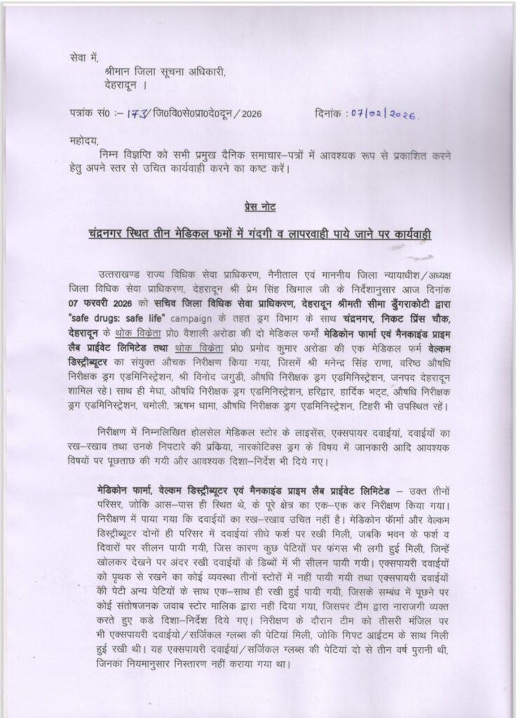 उत्तराखण्ड राज्य विधिक सेवा प्राधिकरण, नैनीताल एवं माननीय जिला न्यायाधीश/अध्यक्ष जिला विधिक सेवा प्राधिकरण, देहरादून श्री प्रेम सिंह खिमाल जी के निर्देशानुसार आज दिनांक 07 फरवरी 2026 को सचिव जिला विधिक सेवा प्राधिकरण, देहरादून श्रीमती सीमा डुंगराकोटी द्वारा “safe drugs: safe life” campaign के तहत ड्रग विभाग के साथ चंद्रनगर, निकट प्रिंस चौक, देहरादून के थोक विक्रेता प्रो० वैशाली अरोडा की दो मेडिकल फर्मों मेडिकोन फार्मा एवं मैनकाइंड प्राइम लैब प्राईवेट लिमिटेड तथा थोक विक्रेता प्रो० प्रमोद कुमार अरोडा की एक मेडिकल फर्म वेल्कम डिस्ट्रीब्यूटर का संयुक्त औचक निरीक्षण किया गया, जिसमें श्री मनेन्द्र सिंह राणा, वरिष्ठ औषधि निरीक्षक ड्रग एडमिनिस्ट्रेशन, श्री विनोद जगुडी, औषधि निरीक्षक ड्रग एडमिनिस्ट्रेशन, जनपद देहरादून शामिल रहे। साथ ही मेघा, औषधि निरीक्षक ड्रग एडमिनिस्ट्रेशन, हरिद्वार, हार्दिक भट्ट, औषधि निरीक्षक ड्रग एडमिनिस्ट्रेशन, चमोली, ऋषभ धामा, औषधि निरीक्षक ड्रग एडमिनिस्ट्रेशन, टिहरी भी उपस्थित रहें।