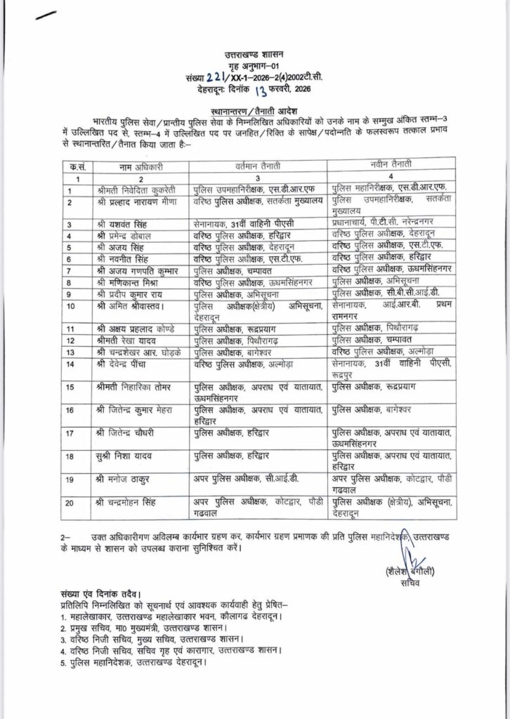 उत्तराखंड शासन द्वारा पुलिस विभाग में बड़ा प्रशासनिक फेरबदल करते हुए 20 आईपीएस अधिकारियों के तबादले किए गए हैं। इस क्रम में राज्य के 8 जिलों—हरिद्वार, देहरादून, उधमसिंहनगर, पिथौरागढ़, चंपावत, रुद्रप्रयाग, बागेश्वर और अल्मोड़ा—के वरिष्ठ पुलिस अधीक्षकों को बदला गया है।