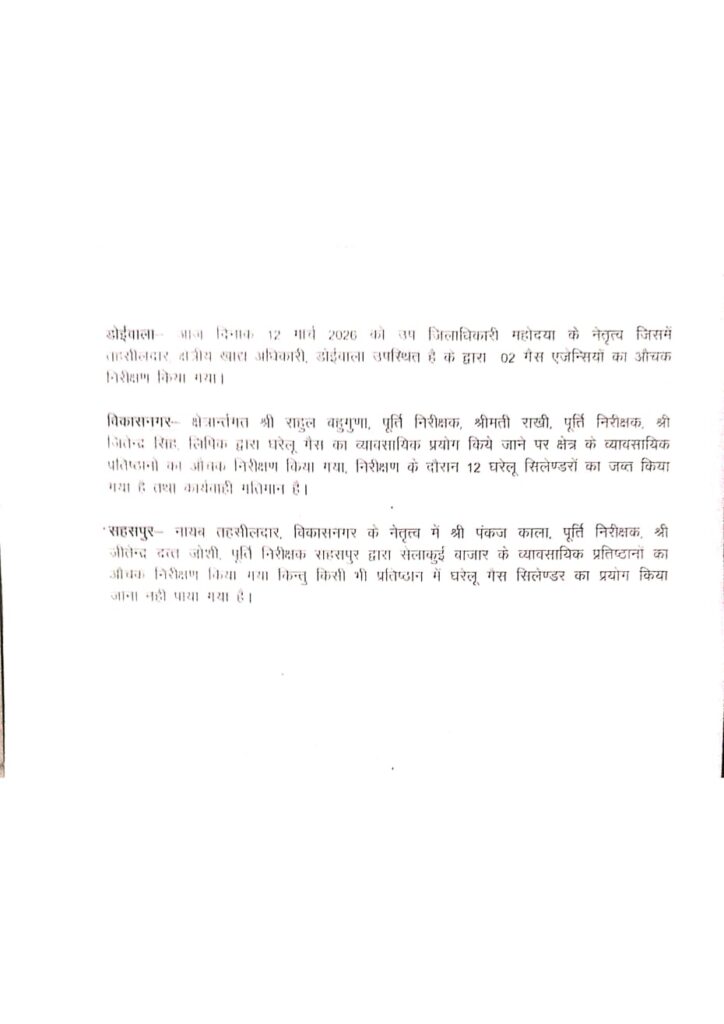 जिला प्रशासन का एक्शन शुरू डोईवाला में 2 तथा विकास नगर में 12 घरेलू सिलेंडर व्यावसायिक उपयोग किए जाने पर किए गए जब्त।