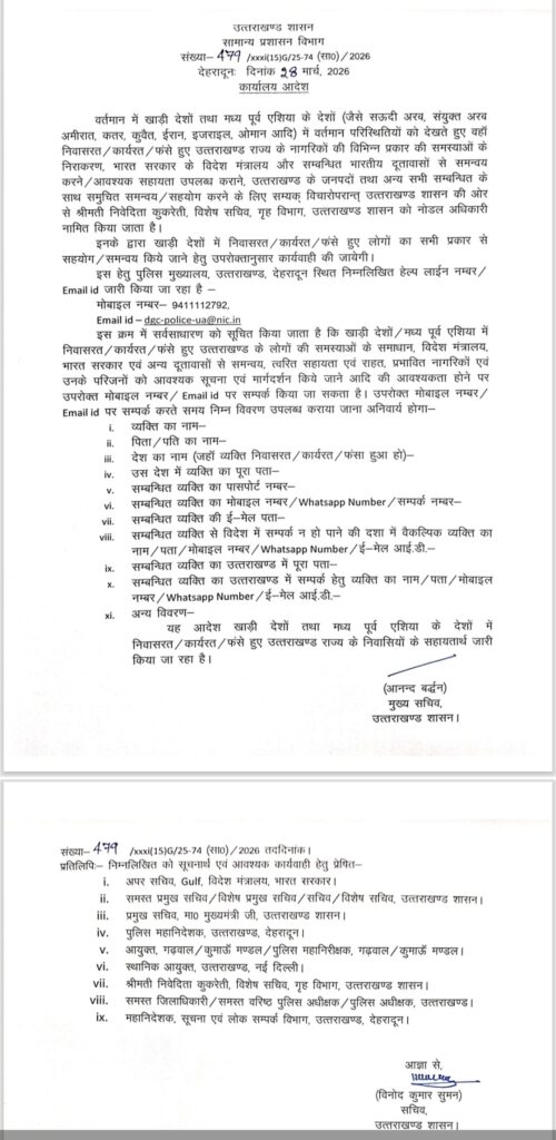 यह आदेश खाड़ी देशों एवं मध्य पूर्व एशिया में निवासरत/कार्यरत/फंसे उत्तराखंड राज्य के निवासियों की सहायता के उद्देश्य से तत्काल प्रभाव से लागू किया गया है।
