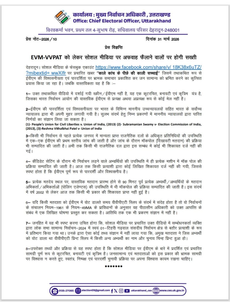 देहरादून। मुख्य निर्वाचन अधिकारी, उत्तराखंड कार्यालय द्वारा EVM-VVPAT से संबंधित सोशल मीडिया पर प्रसारित भ्रामक एवं तथ्यहीन सूचनाओं का संज्ञान लिया गया है। इन अफवाहों के माध्यम से आम जनमानस को गुमराह करने का प्रयास किया जा रहा है, जो न केवल लोकतांत्रिक प्रक्रिया के लिए हानिकारक है, बल्कि कानूनन दंडनीय भी है।