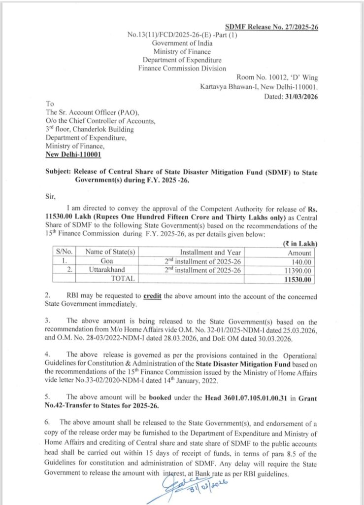 भारत सरकार के वित्त मंत्रालय के व्यय विभाग द्वारा वित्त आयोग प्रभाग के माध्यम से वित्तीय वर्ष 2025-26 के अंतर्गत राज्य आपदा न्यूनीकरण निधि (SDMF) की केंद्रीय हिस्सेदारी जारी करने की स्वीकृति प्रदान की गई है। इस क्रम में उत्तराखंड राज्य को 11390.00 लाख रुपये (रुपये एक सौ तेरह करोड़ नब्बे लाख मात्र) की राशि द्वितीय किश्त के रूप में स्वीकृत की गई है।