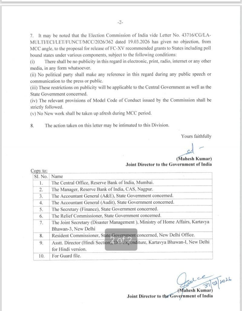 निर्वाचन आचार संहिता के मद्देनज़र निर्वाचन आयोग द्वारा इस धनराशि के निर्गमन पर कोई आपत्ति नहीं जताई गई है, किंतु स्पष्ट निर्देश दिए गए हैं कि इस संबंध में किसी भी प्रकार का प्रचार-प्रसार नहीं किया जाएगा तथा आचार संहिता के सभी प्रावधानों का सख्ती से पालन किया जाएगा। साथ ही आचार संहिता की अवधि में कोई भी नया कार्य प्रारंभ नहीं किया जाएगा।