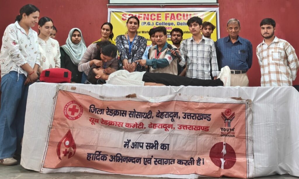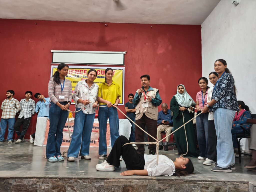 प्रशिक्षण के उपरांत छात्र – छात्राओं से खचाखच भरे सभागार में संयोजक प्रोo एस पी जोशी, प्रोo शशि किरण सोलंकी, प्रोo प्रशांत सिंह, प्रोo झरना बनर्जी, व प्रोo आर के शर्मा के नेतृत्व में डीएवी कॉलेज आपदा प्रबंधन टीम की सीनियर कमांडर रिया बिष्ट, जिया तसव्वुर, स्नेहा, सलोनी पुंडीर, आस्था चौहान ,अमन तोमर, ध्रुव कौशिक,साहिल डोभाल, कमांडर आदित्य राजपूत,आर्यन लिंगवाल, लक्ष्य सैनी,लोकेश सगारु,सौम्या, सारिका भंडारी,रूचि,कृतिका,रितिक रौतेला, इफत, दिव्या गौड़ तथा आयुषी ने इमरजेंसी मेथड्स ऑफ़ रेस्क्यू तथा सीoपीoआरo का सफल एवं कुशल प्रदर्शन किया।