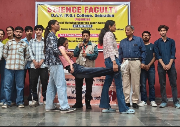 डॉo वर्मा डीएवी कॉलेज के दीन दयाल उपाध्याय सभागार में साइंस फैकल्टी द्वारा "आपदा प्रबंधन के परिप्रेक्ष्य में सामाजिक एवं व्यक्तिगत विकास" विषय पर आयोजित विशेष कार्यशाला एवं प्रशिक्षण शिविर में बतौर मास्टर ट्रेनर प्रोफ़ेसरों एवं छात्र - छात्राओं को सम्बोधित कर रहे थे।उन्होंने कहा कि उत्तराखंड में किसी भी क्षण लगभग 8 रिक्टर स्केल का भूकंप आ सकता है,जो बड़ी तबाही ला सकता है।डॉo वर्मा ने कहा कि आपदा प्रबंधन का प्रशिक्षण युवाओं को आपदा की गंभीर स्थिति में भी शांत भाव से निर्णय लेने की क्षमता विकसित करता है, क्योंकि आपदाएं गहरा सामाजिक, आर्थिक एवं मनोवैज्ञानिक प्रभाव छोड़ती हैं।अतः युवाओं द्वारा प्राप्त अग्नि शमन, रेस्क्यू तथा फर्स्ट एड आदि का प्रायोगिक प्रशिक्षण आपदा के समय स्वयं को सुरक्षित रखते हुए दूसरों का जीवन बचाने की कुशलता प्रदान करता है। वह प्रभावित आम जनता के साथ-साथ महिलाओं विशेषकर गर्भवती महिलाओं , बच्चों, वृद्धजनों,बीमारों , घायलों और दिव्यांगों को आपदाओं के दौरान प्राथमिकता के आधार पर रेस्क्यू करके उनका जीवन सुरक्षित करता है, क्योंकि वह जानता है कि आपदाएं सबसे अधिक उन्हें ही प्रभावित करती हैं।ऐसे समय में उनको इमरजेंसी मेथड्स ऑफ़ रेस्क्यू से सुरक्षित निकालकर समुचित जगह पर ले जाकर प्राथमिक चिकित्सा, आश्रय,भोजन, दवाइयाँ, दूध आदि उपलब्ध कराना बेहद जरूरी है।