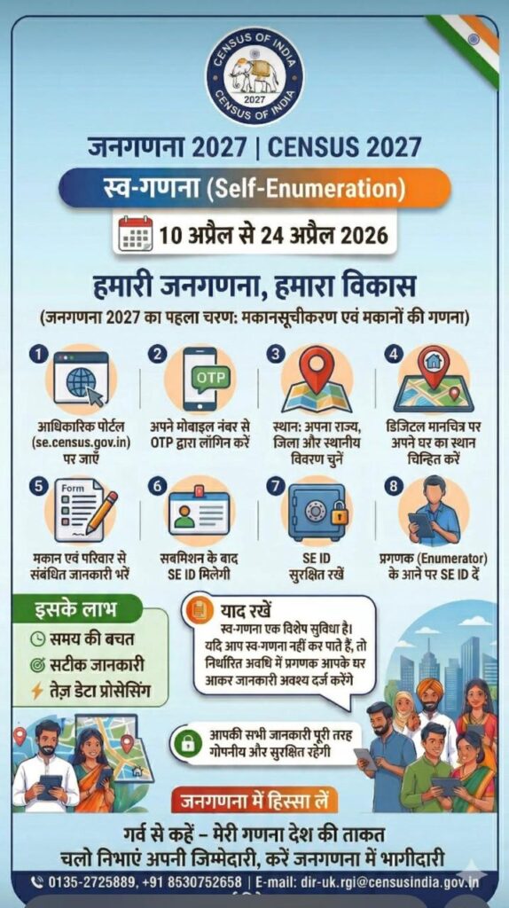 उन्होने बताया कि मकान सूचीकरण कार्य प्रारंभ होने से पूर्व नागरिकों की सुविधा हेतु 10 अप्रैल 2026 से 24 अप्रैल 2026 तक स्व-गणना (Self Enumeration) का विकल्प भी उपलब्ध कराया गया है। इस सुविधा के अंतर्गत नागरिक पहली बार विशेष रूप से विकसित वेब पोर्टल https://se.census.gov.in के माध्यम से अपनी जानकारी स्वयं ऑनलाइन दर्ज कर सकते हैं।