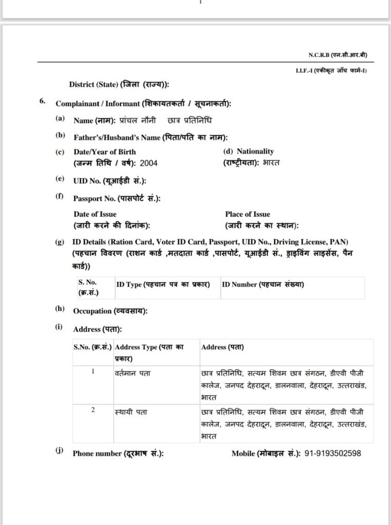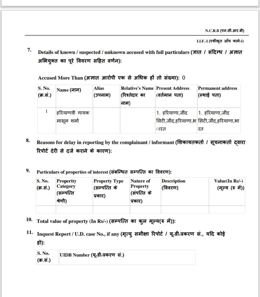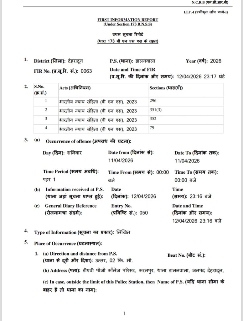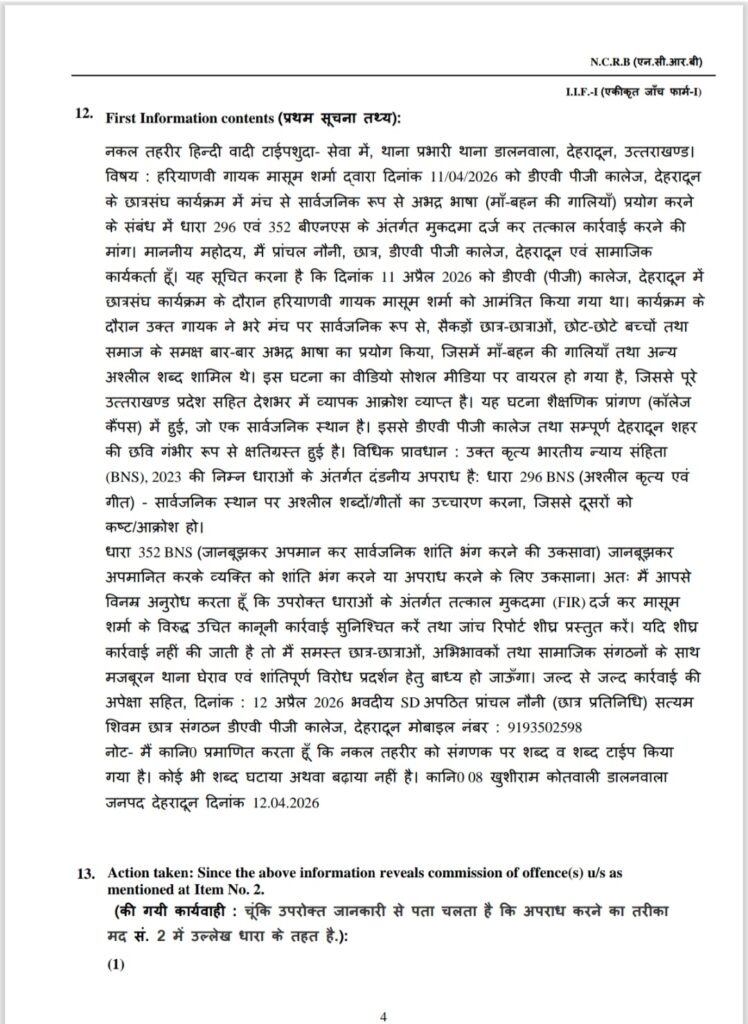 दिनांक 12.4.2026 को थाना डालनवाला पर प्रांचल नौनी (छात्र प्रतिनिधि) सत्यम शिवम छात्र संगठन डीएवी (पीजी) कॉलेज देहरादून मोबाइल नंबर 9193502598 द्वारा लिखित प्रार्थना पत्र बाबत दिनांक 1-4-2026 को डीएवी (पीजी) कॉलेज देहरादून में सांस्कृतिक सार्वजनिक कार्यक्रम के दौरान सार्वजनिक मंच से हरियाणवी लोक गायक मासूम शर्मा द्वारा मंच से अभद्र, अश्लील एवं आपत्तिजनक शब्दों का प्रयोग किए जाने के कारण वहां उपस्थित छात्र- छात्राओं एवं आम जनता की भावनाओं के आहत होने के कारण मासूम शर्मा के विरुद्ध अभियोग पंजीकृत किए जाने, के आधार पर थाना डालनवाला पर मासूम शर्मा, हरियाणवी लोक गायक के विरुद्ध मु0अ0स0 63/2026, अंतर्गत धारा 296,352,79,351(3) बीएनएस, वादी- प्रांचल नौनी उपरोक्त,दिनांक घटना- 11-04-2026, समय- अदम तहरीर, दिनांक सूचना 12*4-2026, समय-23:16 बजे ,घटनास्थल-डीएवी (पीजी) कॉलेज करनपुर परिसर , बनाम- मासूम शर्मा निवासी हरियाणा पंजीकृत होकर विवेचना प्रचलित है। नियमानुसार विवेचनोपरांत वैधानिक कार्यवाही अंजाम दी जाएगी।