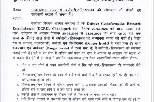 देहरादून, दिनांक 20 मार्च 2026राज्य आपातकालीन परिचालन केंद्र, देहरादून द्वारा प्राप्त जानकारी के अनुसार Defence Geoinformatics Research Establishment (DGRE), चंडीगढ़ के पूर्वानुमान के आधार पर दिनांक 20 मार्च 2026 सायं 05:00 बजे से 21 मार्च 2026 सायं 05:00 बजे तक उत्तराखंड के उच्च हिमालयी क्षेत्रों में बर्फबारी एवं हिमस्खलन (Avalanche) की संभावना व्यक्त की गई…