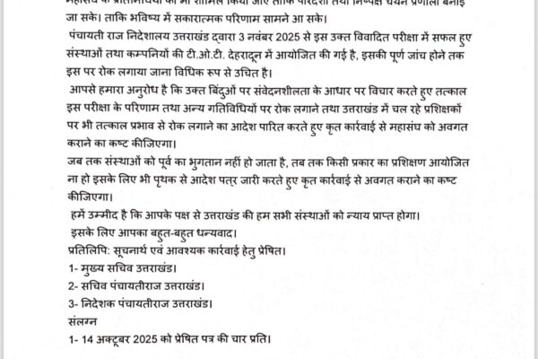 यूपी को संस्था, कम्पनियों को प्रशिक्षण कार्य दिए जाने को परीक्षा का षड्यंत्रमहासंघ ने सीएम, सीएस, सचिव को भेजा पत्र देहरादून।उत्तराखंड गैर सरकारी संगठन (एनजीओ ) महासंघ ने पंचायती राज निदेशालय पर आरोप लगाया कि उनके द्वारा परीक्षा का पेपर अपने चाहतों को पास करने के लिए लीक किया गया था। महासंघ ने कहा कि…
